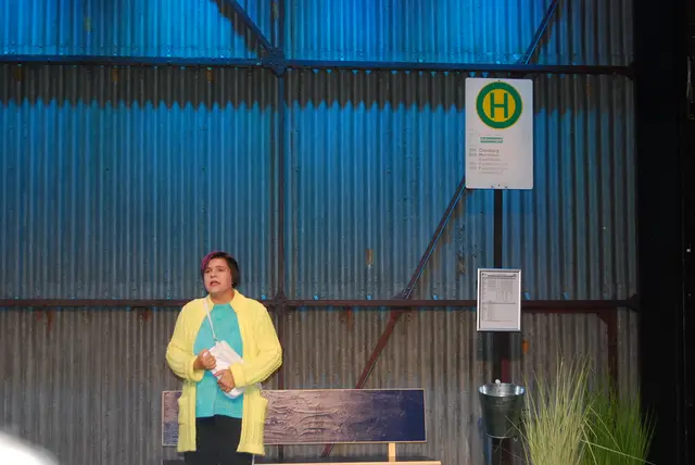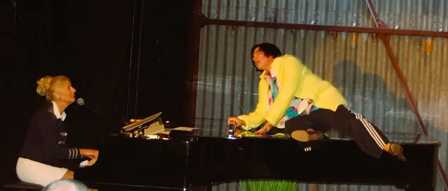 Eine Frau in der typischen Altenheimkleidung mit Jogginghose, T-Shirt und Strickjacke kommt auf die Bühne. Sie singt bekannte deutsche Schlager wie "Nur nicht aus Liebe weinen", "Wie war das noch gestern? Wer war ich noch gestern?".