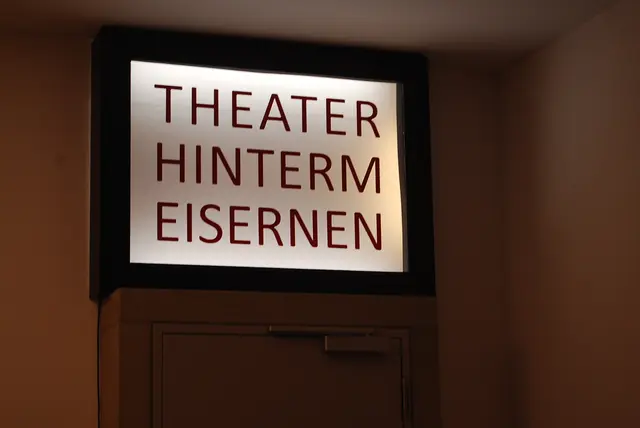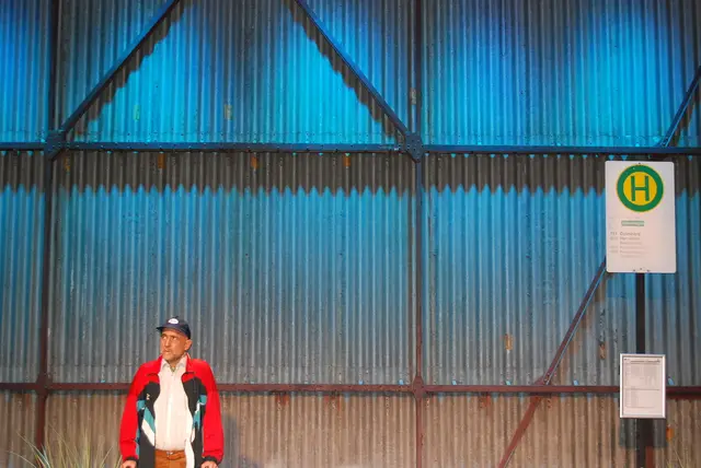 Vor dem Eisernen ist eine Wartestelle aufgebaut, auf der Seite liegt eine große Folienabdeckung. Hildegard Pohl kommt pfeifend herein, schaut sich um, entfernt die Folie - ein Flügel steht da. Sie versucht zu spielen. Kein Ton. Mit einem Schlüssel gelingt es ihr, Motorengeräusche zu starten. Und dann spielt sie Klavier..."I'm singing in the rain".